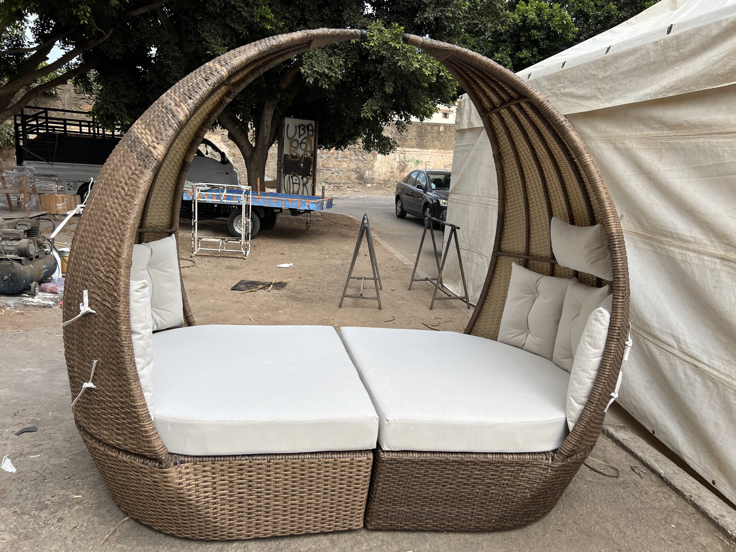 14 August 2024 Lit de jour en rotin “Oasis” avec coussins confortables pour l’extérieur Lit de jour en rotin “Oasis” avec coussins confortables pour l’extérieur