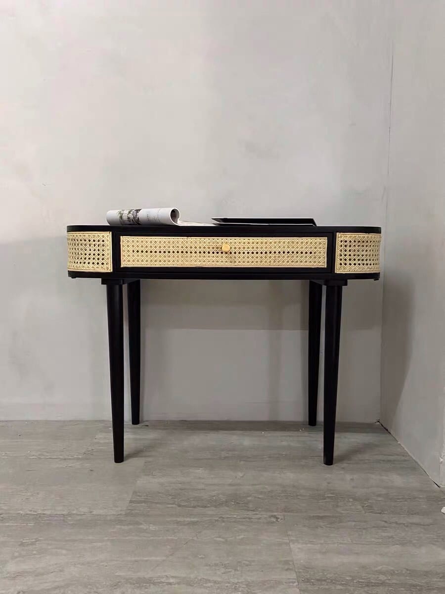 26 November 2024 Console en bois noir avec tiroir en cannage naturel Console en bois noir avec tiroir en cannage naturel