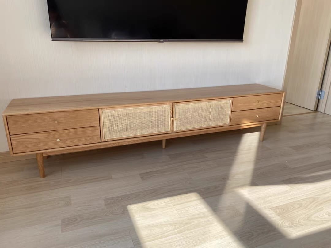 26 November 2024 Meuble TV en bois de chêne avec portes en cannage artisanal Meuble TV en bois de chêne avec portes en cannage artisanal