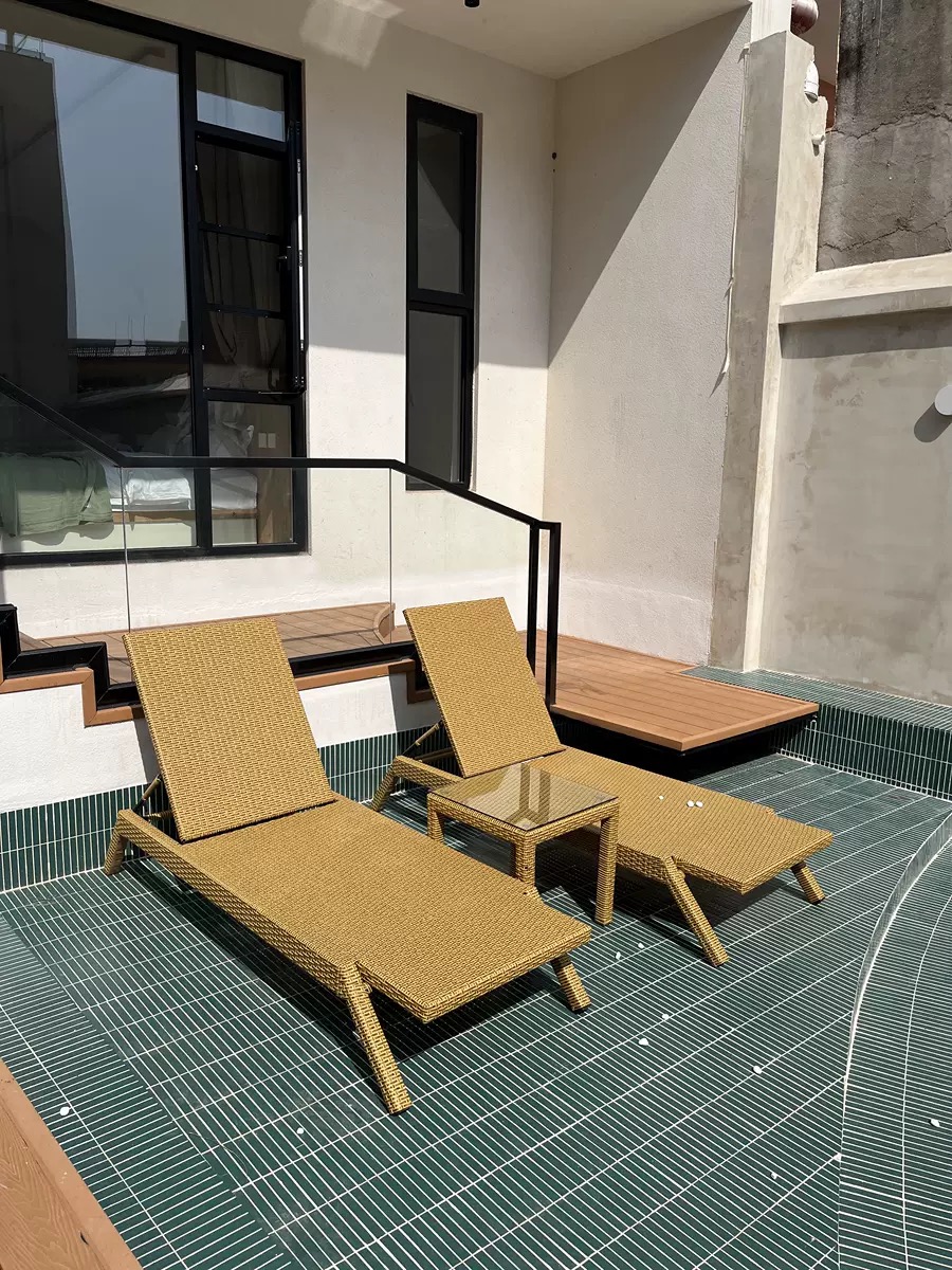 19 December 2024 Chaise longue en rotin dorée avec table basse assortie Chaise longue en rotin dorée avec table basse assortie
