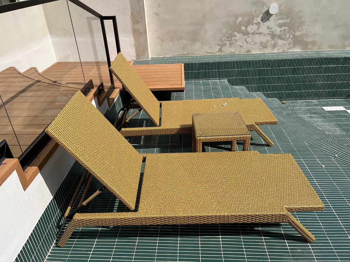 19 December 2024 Chaise longue en rotin dorée avec table basse assortie Chaise longue en rotin dorée avec table basse assortie