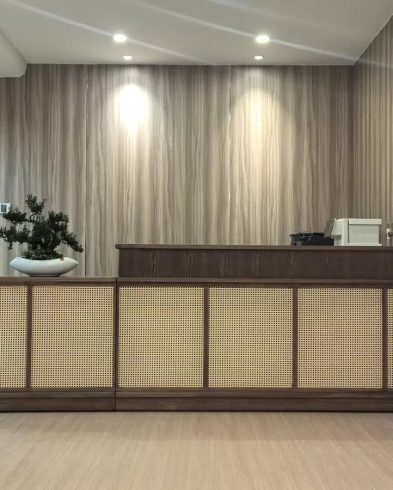 Comptoir d’Accueil en Bois et Cannage Naturel – Fabrication Artisanale