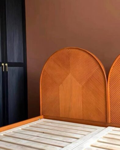 Lit en Bois avec Tête de Lit en Forme d’Arche et Motif Géométrique – Design Unique et Élégance Naturelle